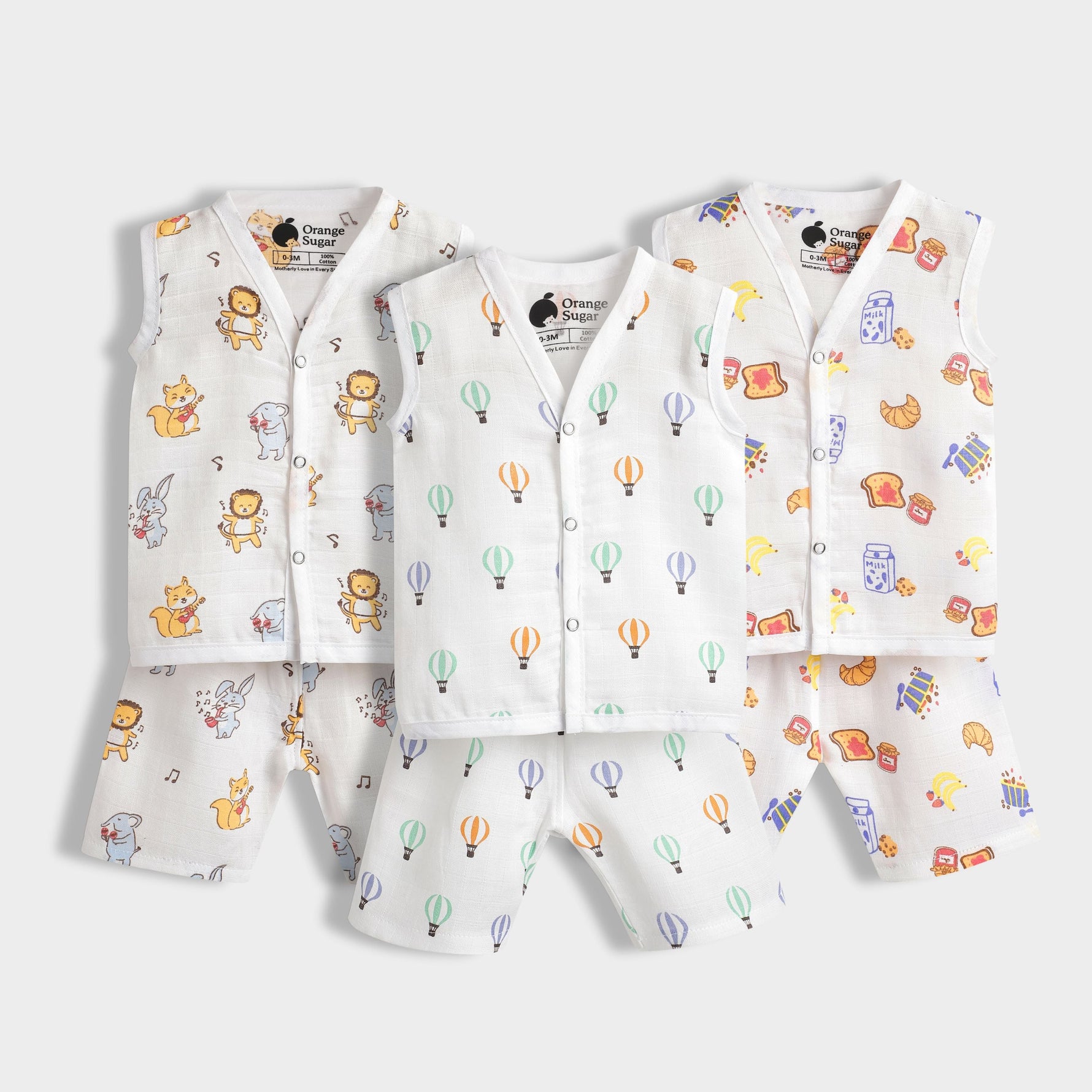 3 Pack Muslin Jhabla Co-ord Set | Jungle Jingles, Balloon Ride, Breakfast