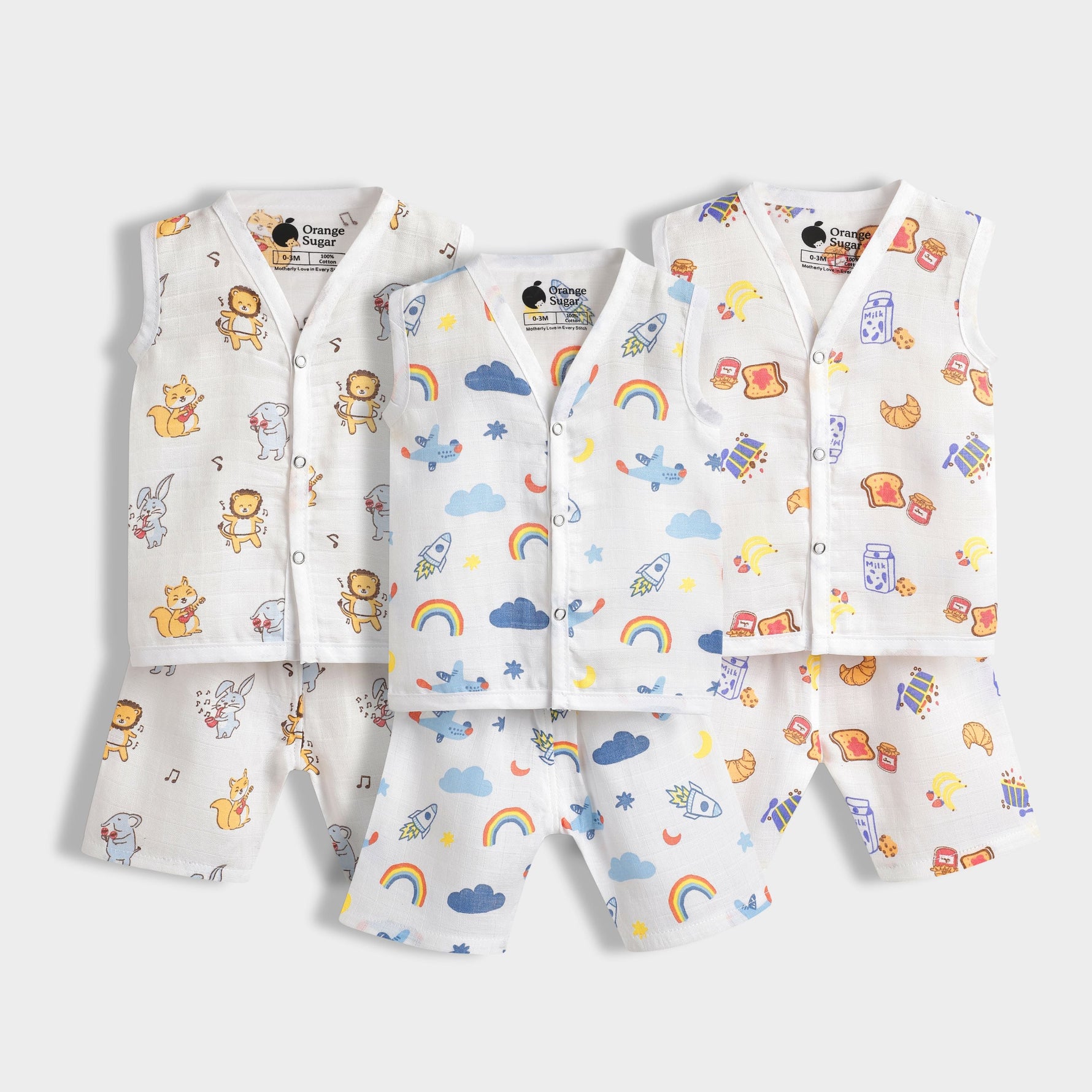 3 Pack Muslin Jhabla Co-ord Set | Jungle Jingles, Starry, Breakfast