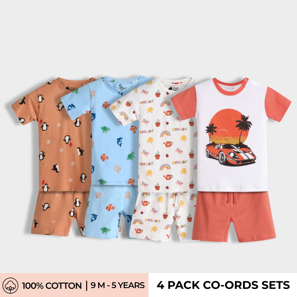 4 Pack T-Shirt & Shorts Unisex Co-ord Set | Penguin Chill, Underwater, Gardening, Car Ride