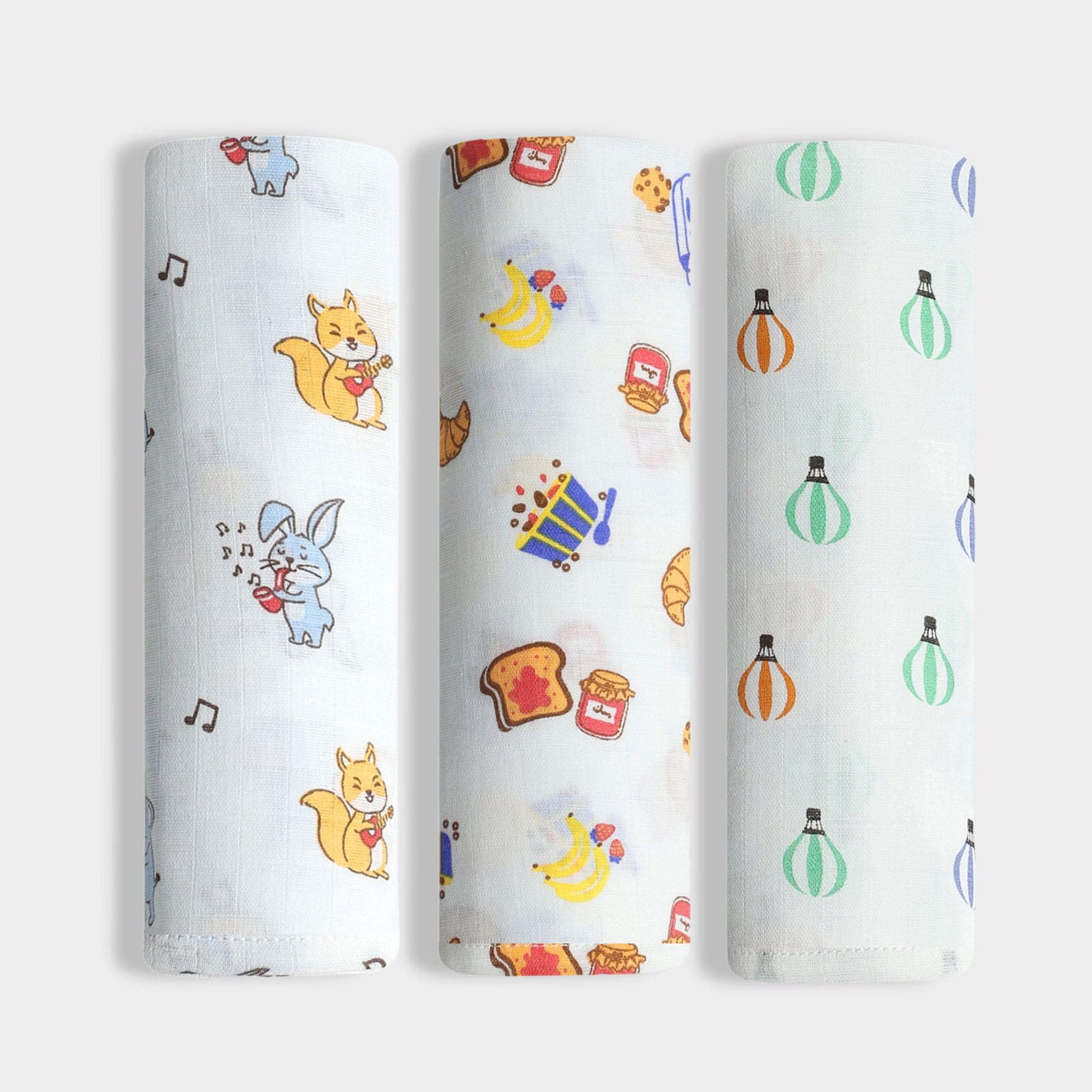 3 Pack Muslin Swaddle | Jungle Jingles, Balloon Ride, Breakfast
