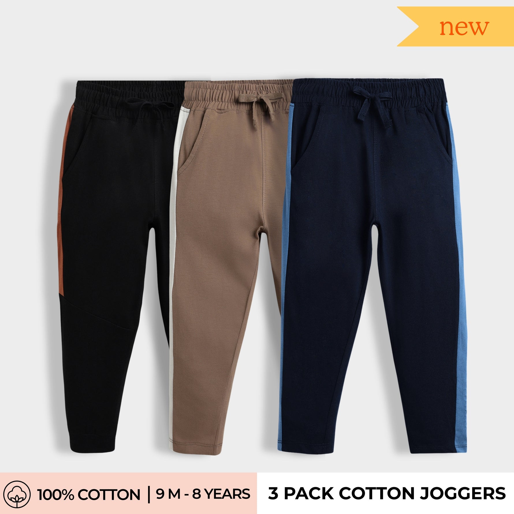 3 Pcs Cotton Joggers | Colour Block Black, Biscuit & Blue