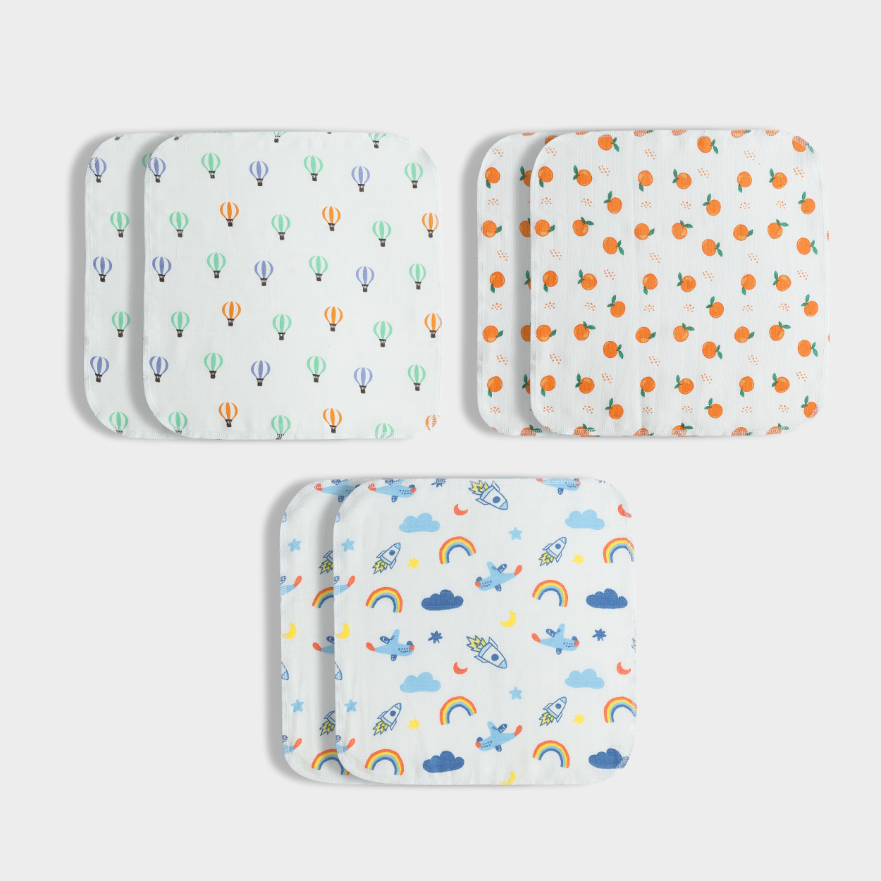 6 Pack Muslin Wash Cloth | Balloon Ride, Starry, Sweet Oranges