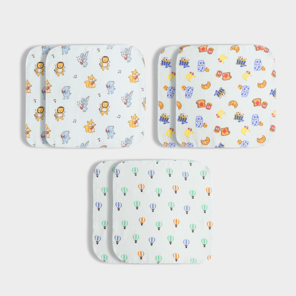 6 Pack Muslin Wash Cloth | Jungle Jingles, Balloon Ride, Breakfast