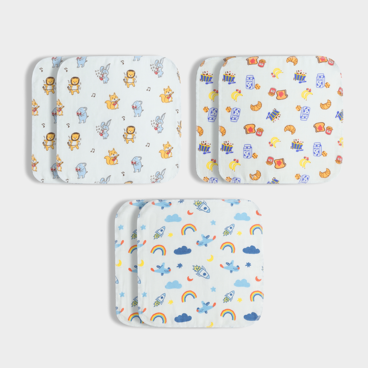6 Pack Muslin Wash Cloth | Jungle Jingles, Starry, Breakfast