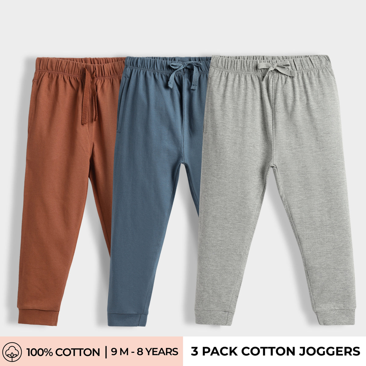3 Pcs Cotton Joggers | Brown, Air Force Blue, Melange Grey