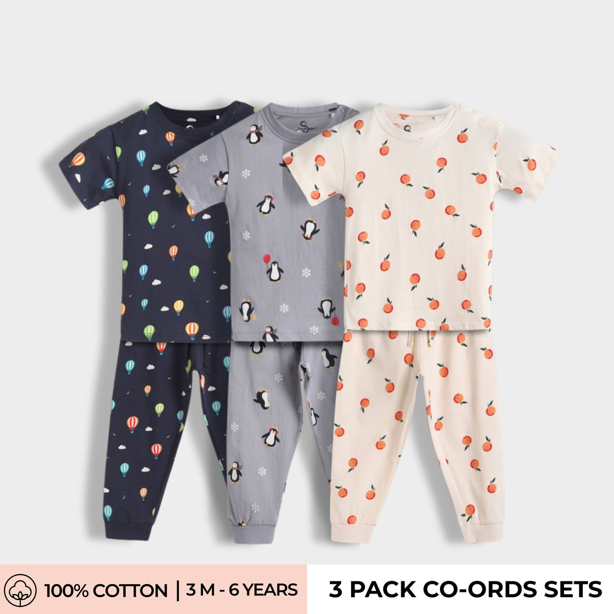 3 Pack Half Sleeves Unisex Co-ord Set | Oranges, Penguin & Hot Air