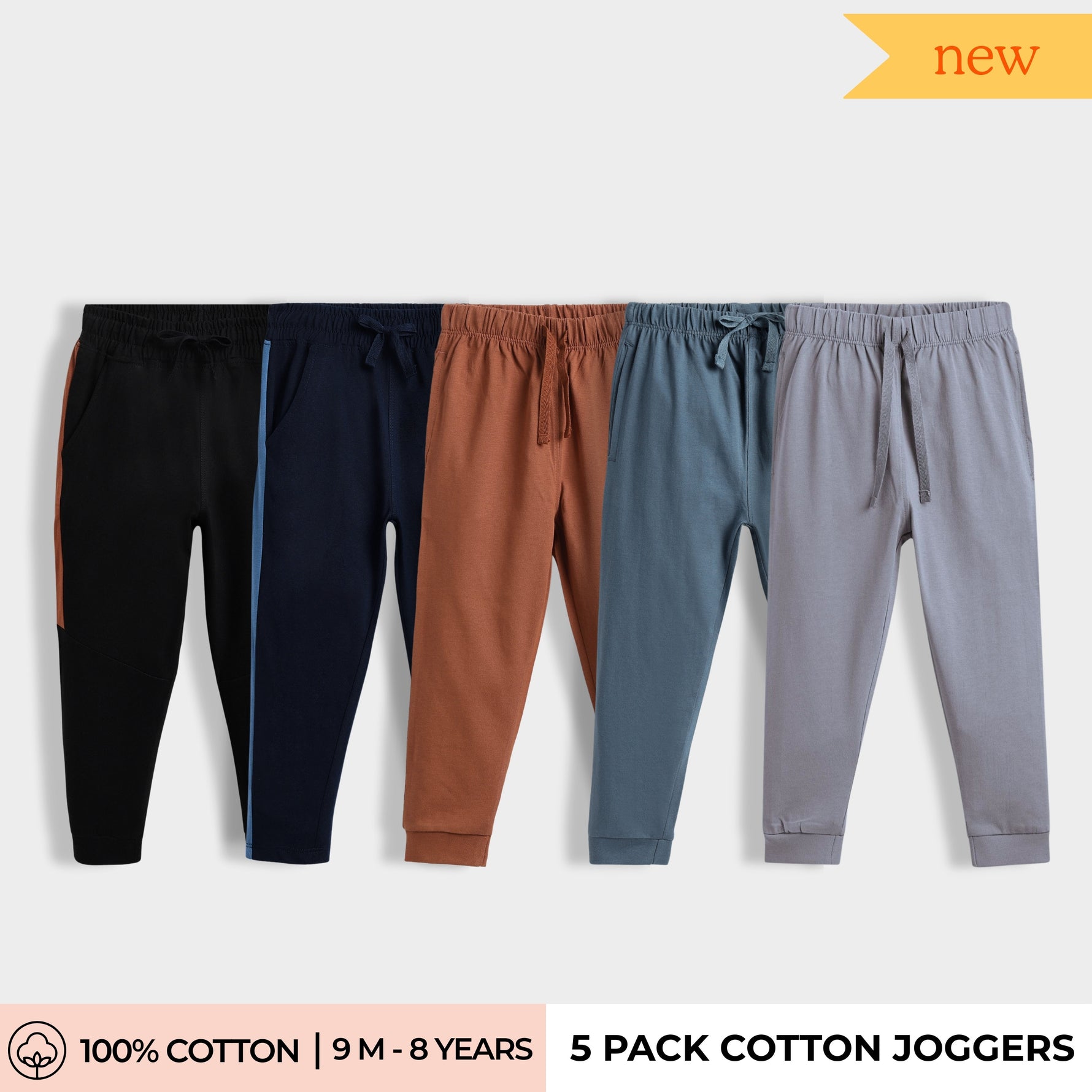 5 Pcs Cotton Joggers | Blue, Black, Grey, Brown, Green