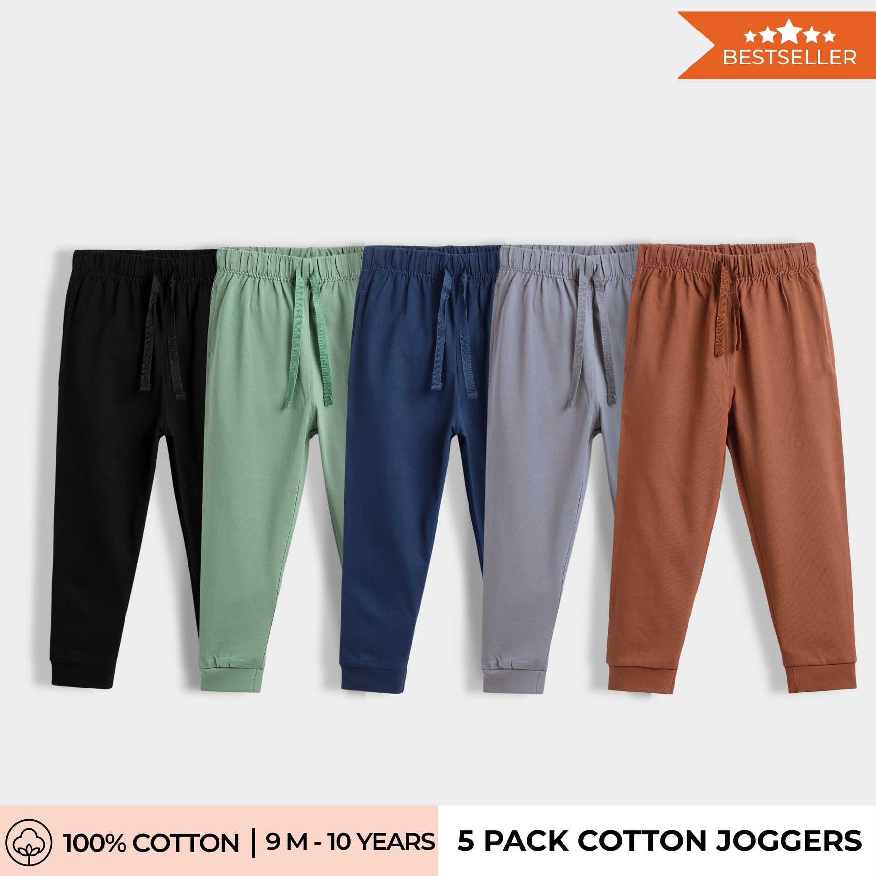 5 Pcs Cotton Joggers | Blue, Black, Grey, Brown, Green